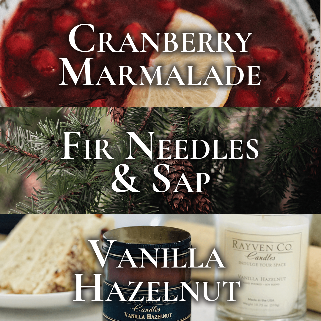 Candle Gift Set Featuring Cranberry Marmalade, Fir Needles & Sap, and Vanilla & Hazelnut Scented Candles